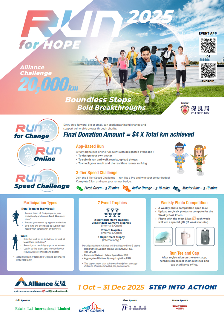 From October 1 to December 31, 2025, participants will collectively aim to reach an ambitious target of 20,000 km. For every kilometer completed, Alliance will donate HKD4 to Po Leung Kuk, supporting its vital social welfare programs. That means if we reach our goal, the total donation will be: 20,000 km × HKD4 = HKD80,000