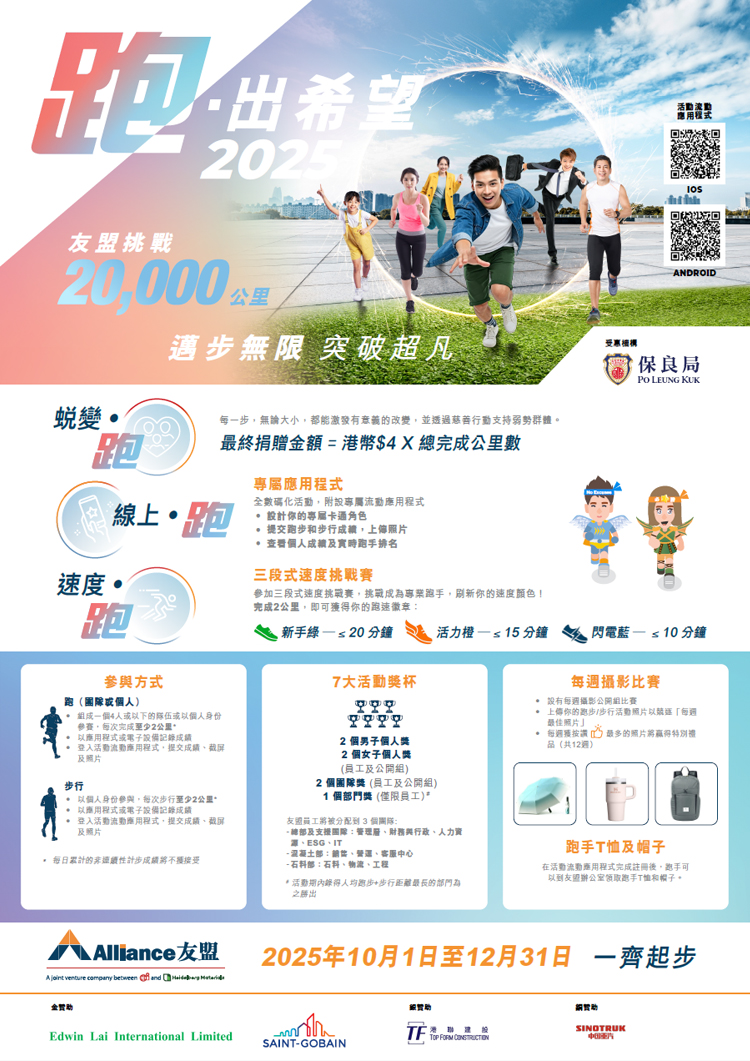 「跑 ‧ 出希望」於2021年首次舉辦,最初為友盟員工專屬的內部活動,因反應熱烈,參加者成績遠超原定1,000公里的目標。受到這份熱情的鼓舞,我們在隨後幾年逐步提升挑戰里數。2022年目標定為3,000公里,2023年增至15,000公里,並逐步向公眾開放參與。2024年更將目標提升至20,000公里,充分展現參加者對社區支援及恆常運動的熱情日益高漲。自2021年至2024年,友盟已向保良局捐出港幣565,000元,以支持其為有需要人士提供的重要社會福利服務。